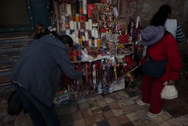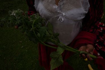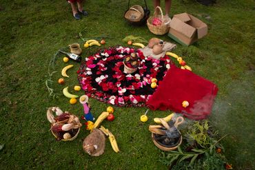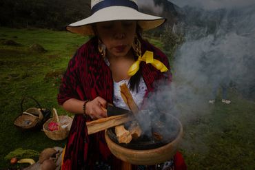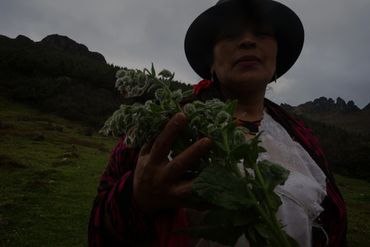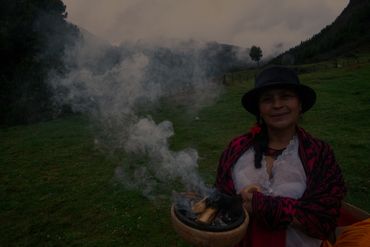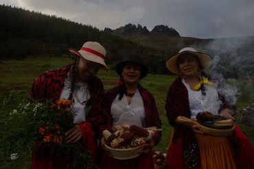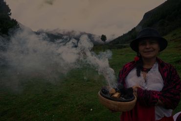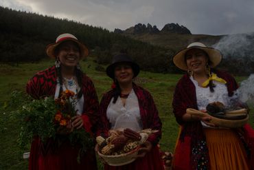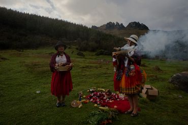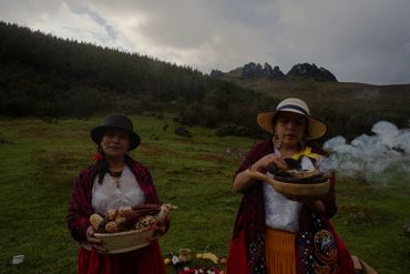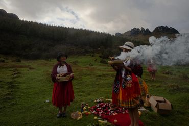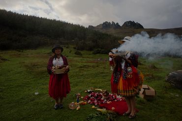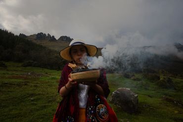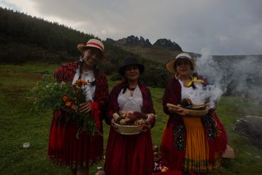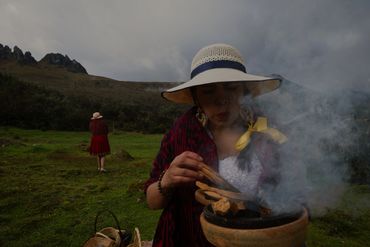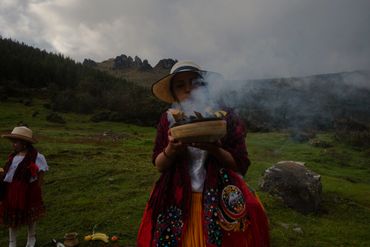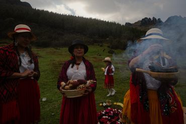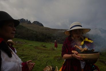 This practice is called is called Ritual de Chakana. The rural women performed this practice to ask pachamama (mother earth) for permission to stop the rain. Using a cross made from plants, food, seeds, they dance and light the smoke of palo santo to pay their respect to la tierra (the planet). While this specific ritual focused on ridding the rain, intentions can vary, but there is always an element of giving thanks to nature.